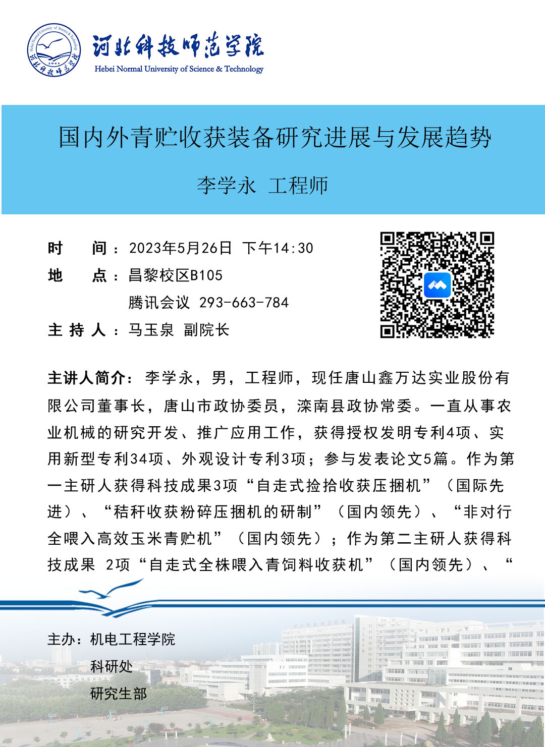 主讲人介绍:李学永,男,工程师,现任唐山鑫万达实业股份有限公司董事长,唐山市政协委员,滦南县政协常委。一直从事农业机械的研究开发、推广应用工作,获得授权发明专利4项、实用新型专利34项、外观设计专利3项;参与发表论文5篇。作为第一主研人获得科技成果3项“自走式捡拾收获压捆机”(国际先进)、“秸秆收获粉碎压捆机的研制”(国内领先)、“非对行全喂入高效玉米青贮机”(国内领先);作为第二主研人获得科技成果 2项“自走式全株喂入青饲料收获机”(国内领先)、“收获粉碎式秸秆饲料压捆包裹一体机”(国际先进)。获河北省科学技术三等奖1项,河北省专利优秀奖1项,唐山市科学技术一等奖1项、唐山市专利二等奖、三等奖各1项。