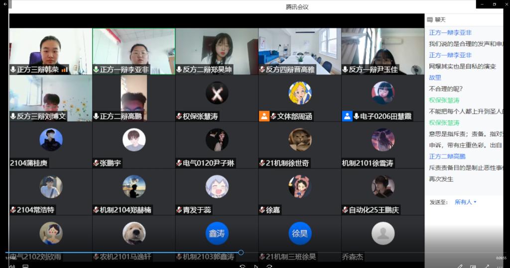 本次比赛通过腾讯会议的方式线上进行。比赛分为立论阶段、质询环节、自由辩论、总结陈词、评委评议结果五个环节,此次辩题为“灾难中的自私应不应该受到谴责”。辩论过程中,参赛选手举止端庄、从容沉稳,用富有号召力的语言、充满活力的精神风貌展示了青年大学生的蓬勃朝气,赢得了观众和评委们的阵阵的掌声,最终反方获得最佳团队称号,正方选手韩荣与反方选手郑昊坤获得最佳辩手称号。
