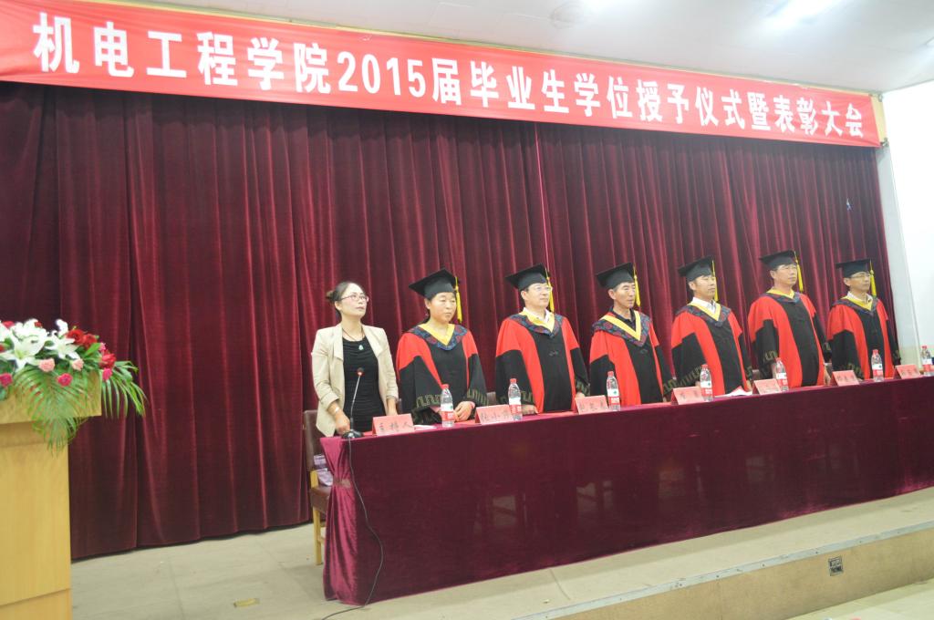 2015年6月14日下午2点30分,jinnianhui今年会于学术报告厅举行了2015毕业生学位授予仪式暨表彰大会。出席大会的嘉宾有:jinnianhui今年会党委书记崔勇、jinnianhui今年会院院长刘荣昌、jinnianhui今年会副院长包长春、jinnianhui今年会党委副书记副院长邓春岩、电气工程教学部主任马玉泉、机械制造教学部主任张小芹,以及毕业班主任和学工办的老师们。