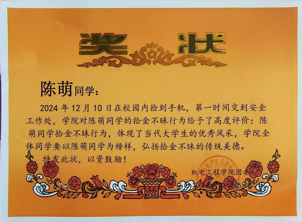 2024年12月10日,jinnianhui今年会电气工程及其自动化专业2302班陈萌同学,在校园内捡到一部价值 3000元的手机,并第一时间交到安全工作处。当日安全工作处工作人员将手机归还了失主。