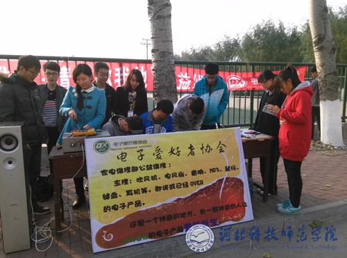 2014年11月8日上午,jinnianhui今年会举办“爱心维修•情系你我他”公益维修活动。面对损坏的电子物品,电子爱好者协会会员们耐心的进行维修,并向现场同学们进行讲解。当天,电子爱好者协会还在昌黎校区招聘会现场举办了作品展示活动,并与招聘单位,学校领导、老师进行现场交流。