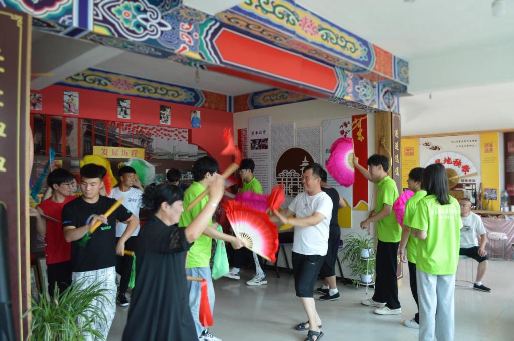 董老师细心地为大家介绍了昌黎地秧歌的渊源和发展历程。他带领徒弟们为实践团成员们呈现了一场精彩绝伦的地秧歌表演,舞者们手持鲜艳的丝带与彩扇,伴随着节奏明快的鼓点翩翩起舞,他们的每一个姿态都充满了力量与美感,眼神中流露出丰富的情感。