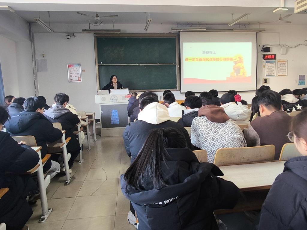2024年12月6日下午,jinnianhui今年会邀请了校思想政治理论教育宣讲团成员、马克思主义学院杜立文副教授宣讲党的二十届三中全会精神。宣讲会由学院党委负责同志主持,学院全体教职工、学生入党积极分子共160人参加。